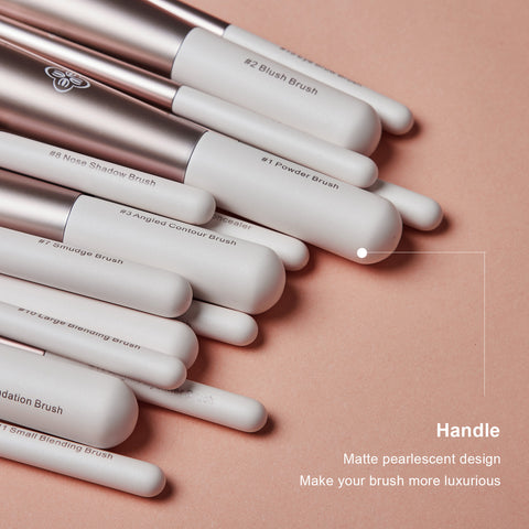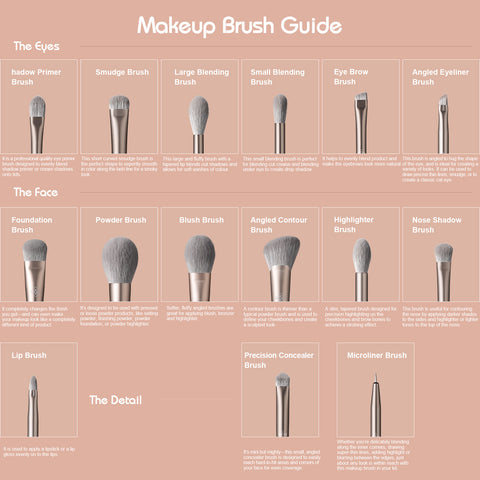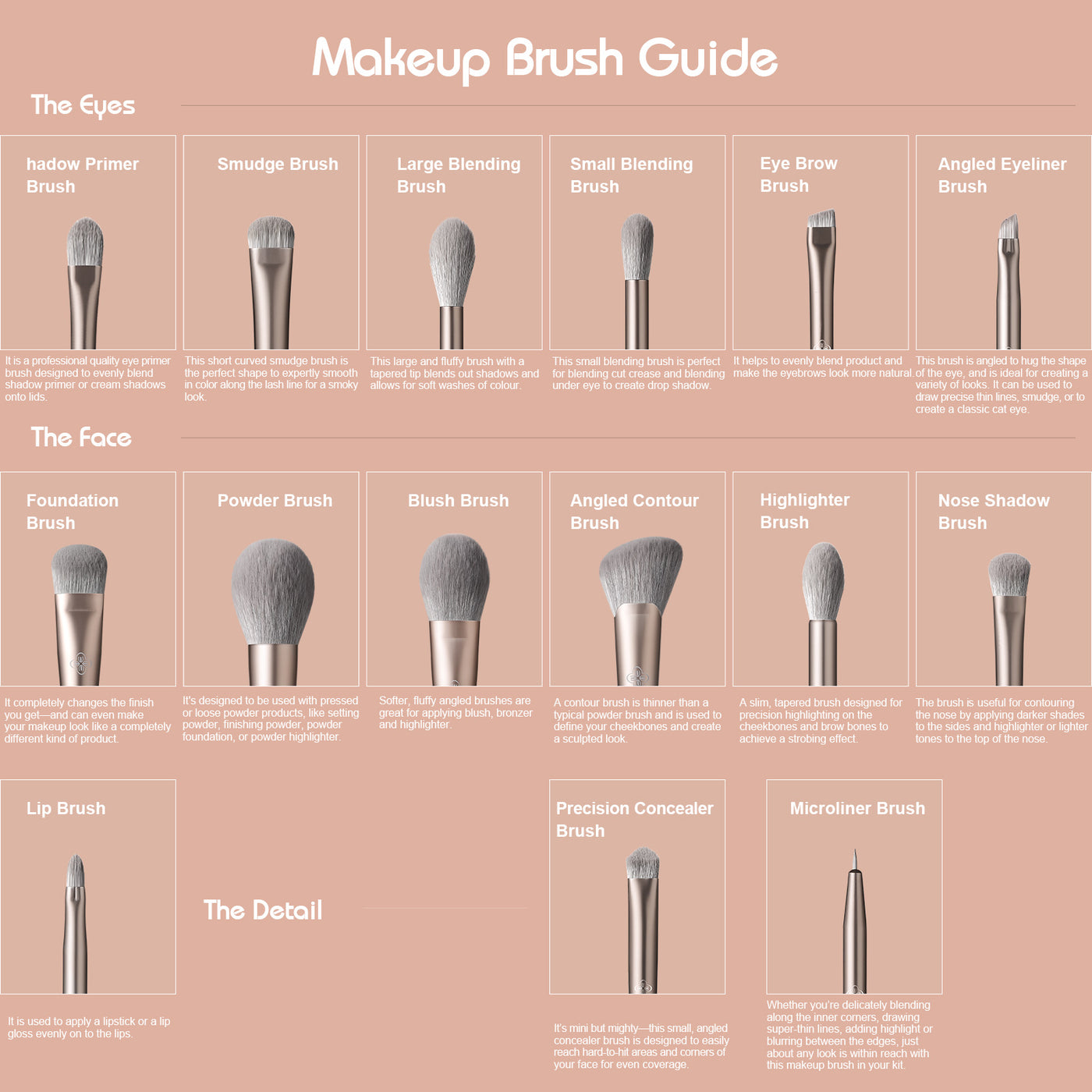 A set of brushes (angled contour, foundation and powder) apply foundation, shadow, and use with tapered highlighter brush, nose shadow brush to shape and sculpt your face. A precision concealer brush comes in handy to highlight desired areas and help you disguise blemishes and under-eye circles for a flawless finish.