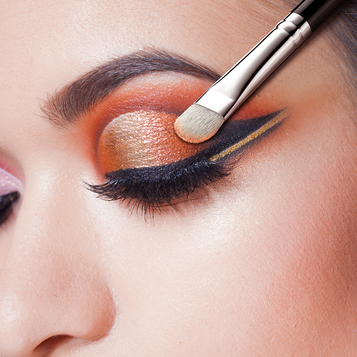For defining the outer V of your eyelid, dip the E831 into your dark shadow and blend it into the deep part of your crease. To emphasize your inner corner, apply a bright shimmer shade. After applying your eyeliner pencil, smudge it out with the E831.